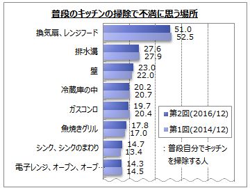 さらに、普段はあまり掃除しないが、汚れが気になり始めたら掃除する場所を聞いたところ、「換気扇、レンジフード」が39.4%、「冷蔵庫の中」が25.5%で上位となったほか、「壁」「電子レンジ、オーブン、オーブントースター」「排水溝」などが続いた。