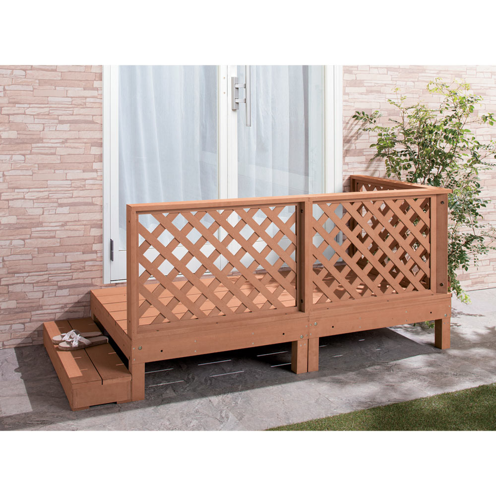 ウッドデッキは、生活者が簡単に設置できるよう、シンプルなパーツを合わせて組み立てられる構造にした。2色、フェンス柄3種。