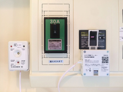 配付する感震ブレーカーは、生方製作所製「ピオマ感震ブレーカー」。震度5強以上の地震の揺れを正確に検知し光と音で知らせ、地震検知から3分後に分電盤の主幹ブレーカーもしくは漏電ブレーカーを機械的に落とし自宅の電気を遮断する。設置に電気工事等は不要。