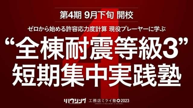 鈴木淳さんが講師を務める『全棟耐震等級3 短期集中実践塾・第4期』が9月からスタートします!詳細はバナーをクリック!▼▼▼