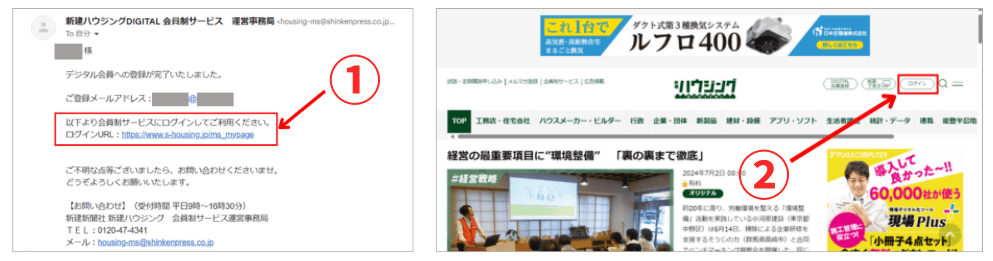 登録が完了すると【デジタル会員 登録完了のお知らせ】がメールで届きます。本文の中の①[ログインURL]をクリックするか、新建ハウジングDIGITALの②[ログイン・マイページ]からログインしてください。